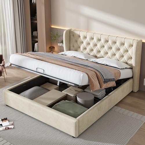 LERFAN Sängklädsel, dubbelsäng, 180 x 200 cm, hydraulisk funktionell säng med ribbotten och förvaringsutrymme, mjukt överdrag av hudvänligt sammetstyg, L 207 x 186 B x 99 H cm, beige