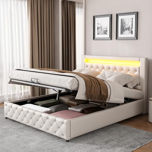 DUlVBPE Sängklädsel, 180 x 200 hydraulisk förvaringsutrymme-barnsäng med USB och färgskiftande LED-ljusremsor, beige linne enkelsäng