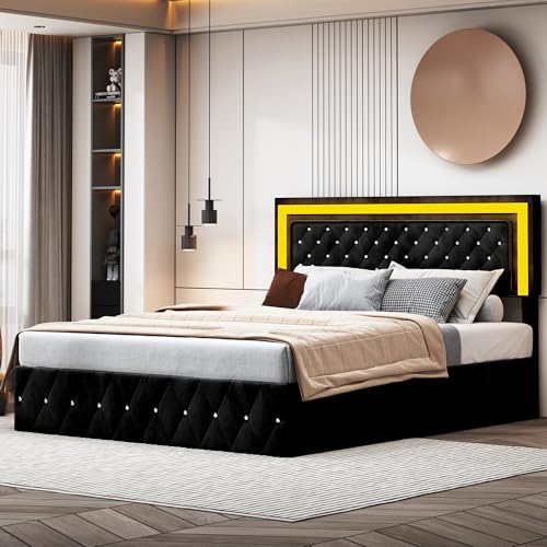 jeerbly Sängklädsel, klädsäng, förvaringssäng, dubbelsäng med LED-remsor, pneumatisk förvaringssäng med dragflikar, sammet (svart, 140 x 200)