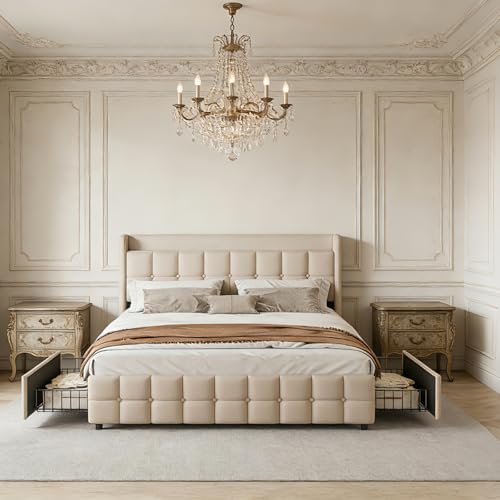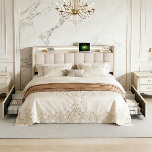 DADEA Sängram med 4 förvaringslådor, LED-säng, 180 x 200 cm, säng med förvaring med USB-kontakt, dubbelsäng med förvaring, enkel montering, beige