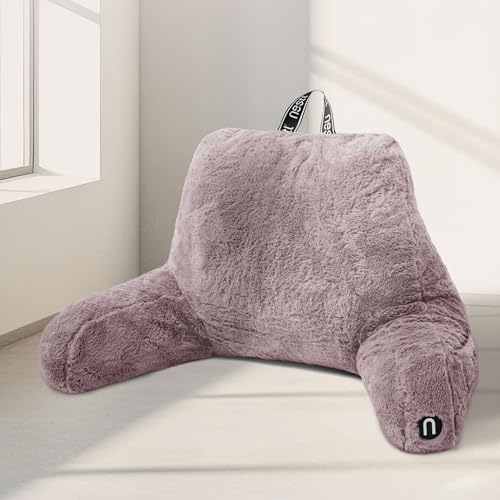 Nestl Päls läskudde, snygg ryggkudde för säng sittande, falsk päls sängstolskudde med armar, läskuddar för att sitta i sängen vuxen och barn, ryggstödskudde för sängstöd – dammig lila