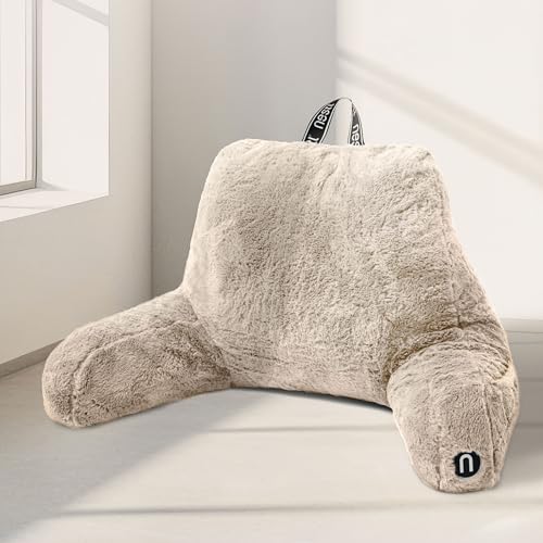 Nestl Päls läskudde, snygg ryggkudde för säng sittande, falsk päls sängstolskudde med armar, läskuddar för att sitta i sängen vuxen och barn, sitta upp ryggstödskudde för sängstöd – linne
