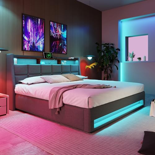 ZYLOYAL10 Klädd sängstomme med USB-uttag och LED-ljus, dubbelsäng med ribbotten av metallram, sängstomme av linnematerial, ungdomssäng (grå 160 x 200 cm)