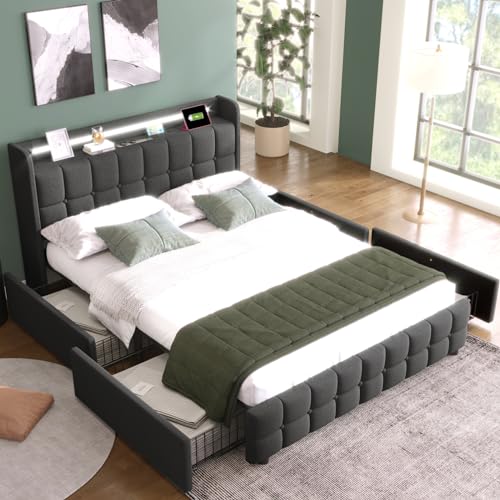 Vadderad säng 160 x 200 cm, förvaringssäng med 4 lådor, Dubbelsäng med LED-upplyst huvud- och USB-laddningsfunktion, sängstomme med träribbotten, linne, grå