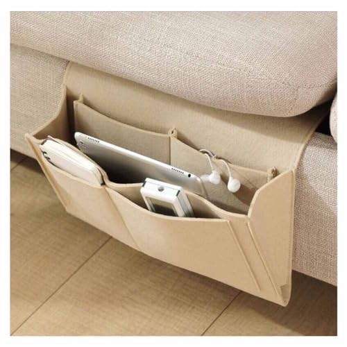 SHTGOI Sängväska filt nattduksbord organiserare halkfri sängorganiserare för att hänga soffa förvaringsväska med 5 fickor nattduksväska för bok, glasögon, telefon, iPad, fjärrkontroll beige