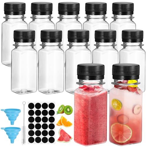Hejo 12-pack juiceflaskor i plast med lock, 60 ml små shotflaskor, återanvändbar minipastflaska, tom ingefärsflaska med etiketter för juice, sås, mjölk (svart lock)