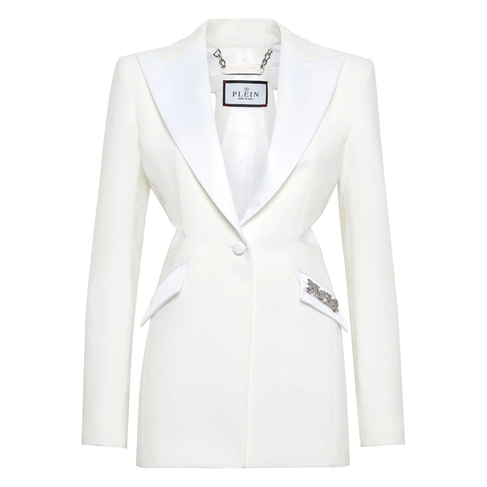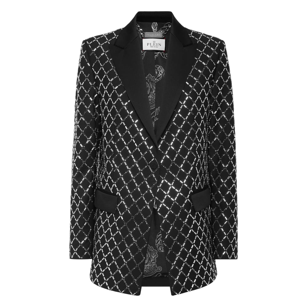 Philipp Plein, Jackor , Dam, S, Läder, Boyfriend-blazer i ull och satin med kristallromber