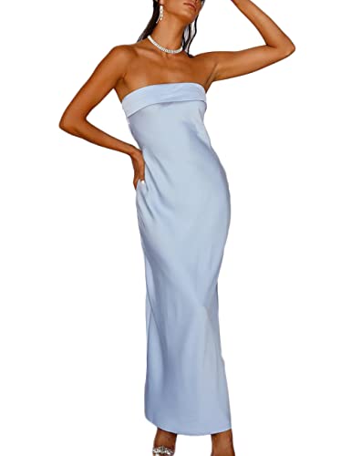 Realtix Satin Silk Backless Tube Tops Maxi Dress for Women Low Back Hollow Out Elegant Strapless Long Dresses Wedding Guest Blue
