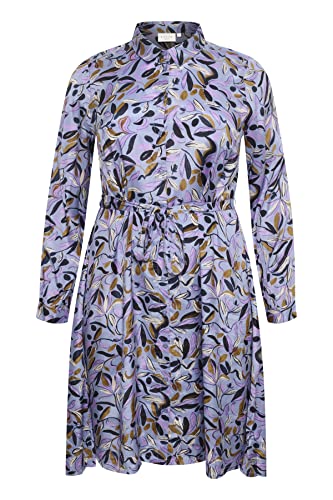 Kaffe Curve dam Plus storlek tunic klänning satin långa ärmar slips midja avslappnad, blå målade löv, 44