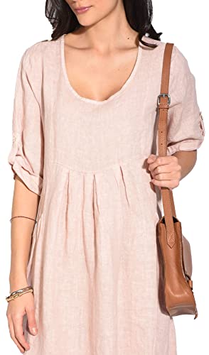 Damklänning 100% linne tillverkad i Italien, långärmad klänning med volang V-hals, satin, storlek: XL, Satin, XL