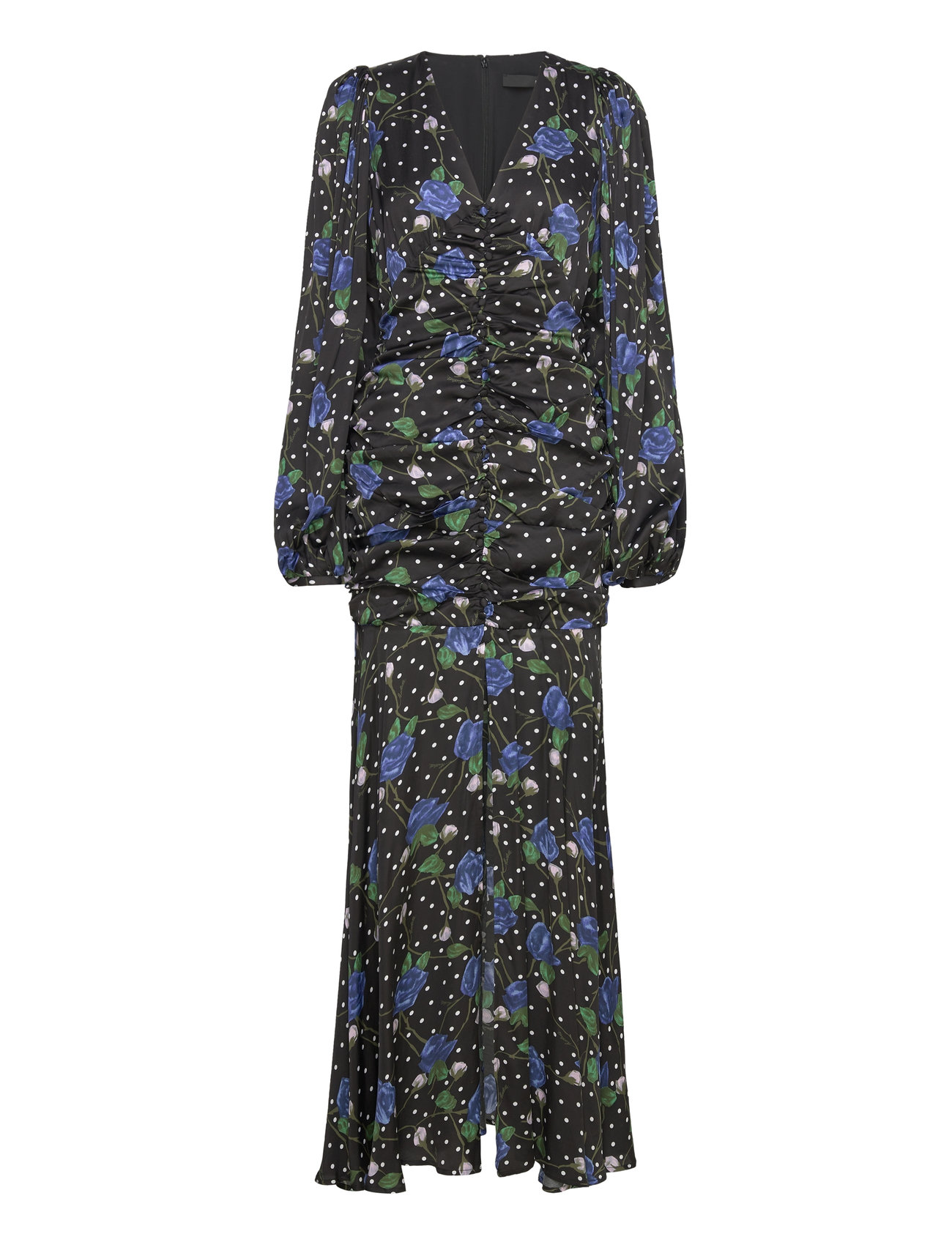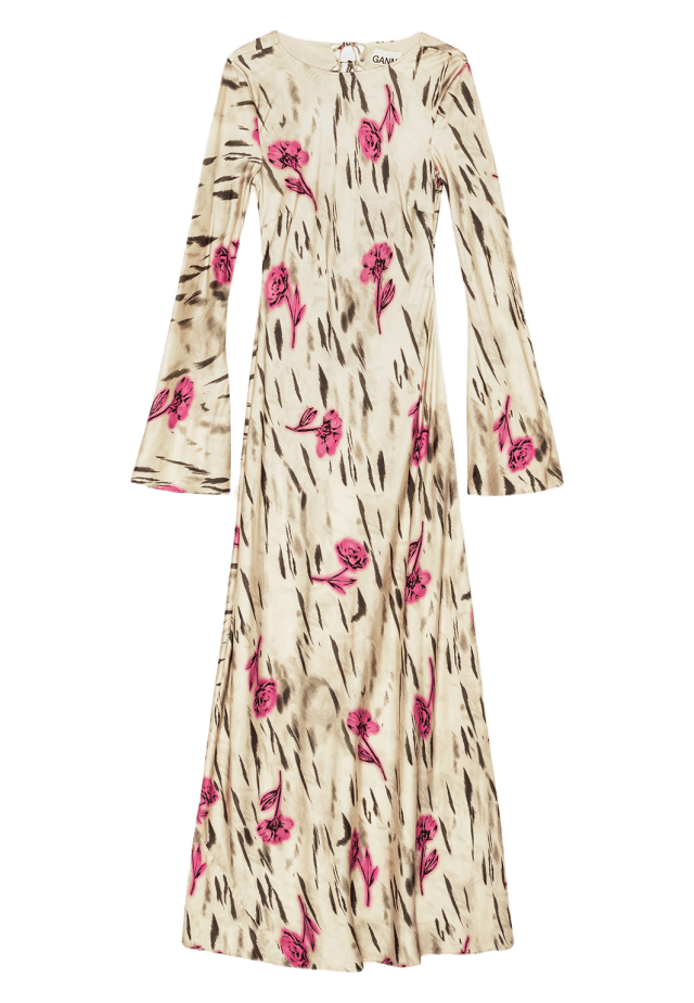 GANNI Printed Stretch Satin Long Sleeve Maxi Dress Flerfärgad