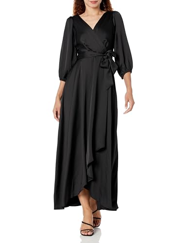 DKNY Women's Balloon Sleeve Satin Faux Wrap Maxi Dress, Black, 10