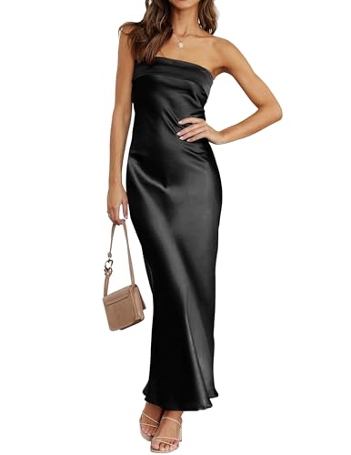 MEROKEETY Women 2025 Summer Strapless Satin Tube Bodycon Backless Wedding Guest Maxi Dress, Black, L