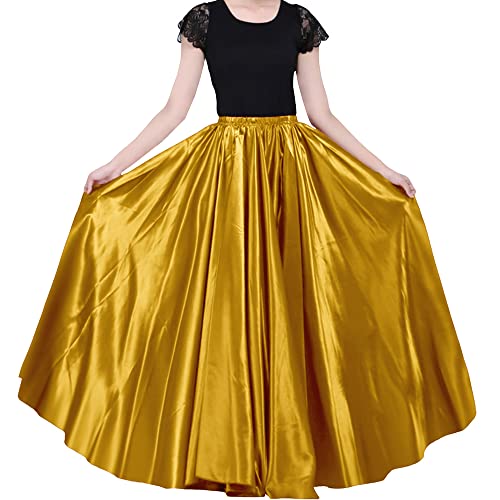 Ladies 90cm Satin Maxi Midi Skirt Long Dress Elastic Waist for Belly Dance Princess Party Cosplay Costume (deep Gold)