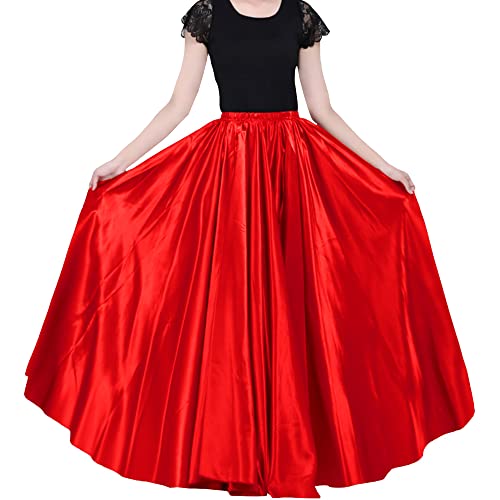 Damer 90 cm satin maxi midi kjol lång klänning elastisk midja för Belly Dance Princess party cosplay kostym, röd, one size