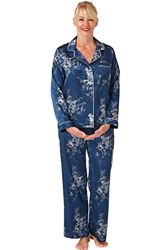 Reliwel Dampyjamas i Satin Pyjamas Dam Tvådelad Långärmad Pyjamasset Med Knappar Silke Mjuk V-ringning Öppen Framsida Och Byxor Sidoväskor, Marinblå, XXL