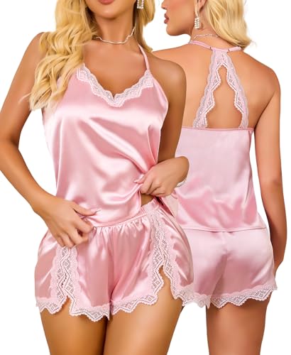 RSLOVE Satin pyjamas dam sexig – sidenpyjamas-set kort 2-delat nattlinne, ROSA, M