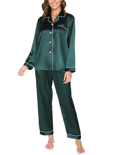 Reliwel Dampyjamas i Satin Pyjamas Dam Tvådelad Långärmad Pyjamasset Med Knappar Silke Mjuk V-ringning Öppen Framsida Och Byxor Sidoväskor, Grön, S