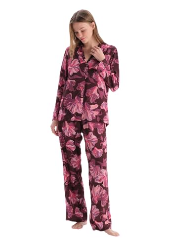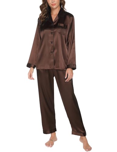 Reliwel Satin pyjamas dam med knappslå långärmad tvådelad pyjamas dam lång v-ringad nattkläder mysig klassisk vardagsklädsel hemmadräkt pyjamas för alla årstider, BRUN, M