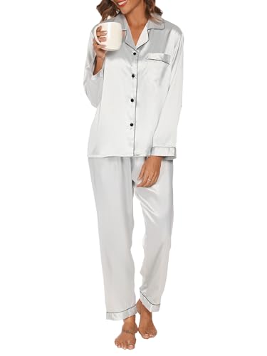 Reliwel Dampyjamas i Satin Pyjamas Dam Tvådelad Långärmad Pyjamasset Med Knappar Silke Mjuk V-ringning Öppen Framsida Och Byxor Sidoväskor, Grå, M