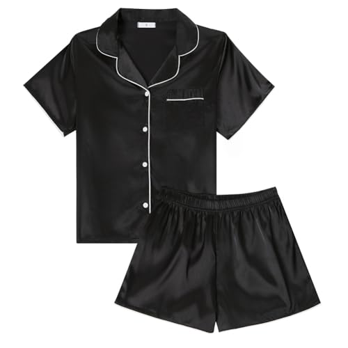 LYANER Dam satin pyjamas-set kortärmad knapp skjorta silkeslena nattkläder med shorts set PJ, svart, stor
