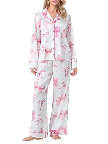 Dam höst 2 delar lounge outfit rosett tryck satin pyjamas set långärmad knapp nattkläder set, A-a-rosa, S