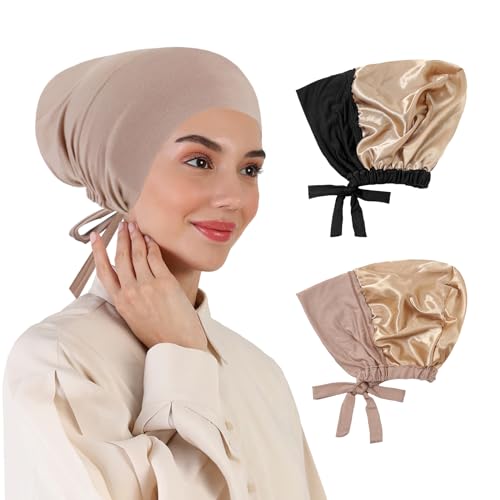 XEPST 2 st satin hijab underkeps för kvinnor, inre huvud scarf turbaner för kvinnor kemo hatt sovmössa, svart + kaki