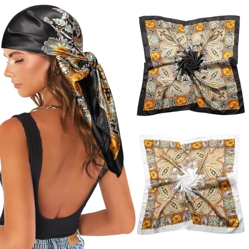 AWAYTR 35” Large Satin Square Head Scarf - 2Pcs Silk Like Floral Head Scarves Square Satin Hair Scarf Bandanas for Women (Cashew(Black/Beige))