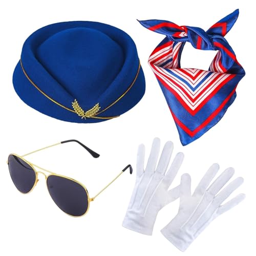 Flygvärdinna kostym | 4 st flygvärdinna kostym för kvinnor | flygvärdinna hatt handskar satin scarf solglasögon | kostym med flygvärdinna hatt | cosplay kostymtillbehör för kvinnor flickor