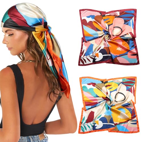 AWAYTR 35” Large Satin Square Head Scarf - 2Pcs Silk Like Floral Head Scarves Square Satin Hair Scarf Bandanas for Women (Flower(Red/Yellow))