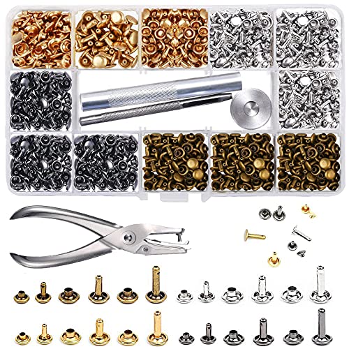 McNory Sats med 480 lädernitar, 3 storlekar, dubbelnit, rörformiga metallstift, med 4 verktyg, tång/fastsättningsverktyg, för egentillverkning av läderhantverk, kläder (silver, brons, guld, svart)