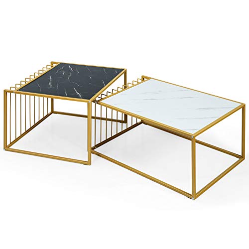 GIANTEX Set med 2 sidobord i marmor guld, soffbord, olika storlekar, vardagsrumsbord, hopfällbart, soffbord, satsbord, modern design, nattduksbord, gyllene metallram