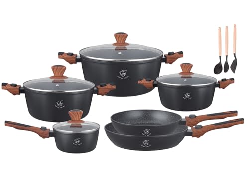 Royal swiss® Set med Saucepan stekpannor och redskap, 13 stycken, avtagbara handtag, marmorbeläggning, induktion, PFAS-fri, för alla värmekällor svart (beige, 13)