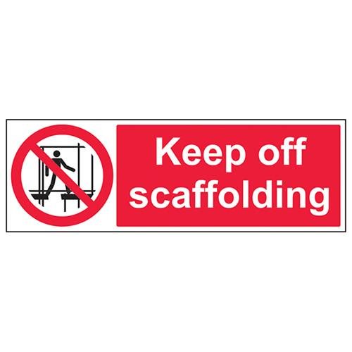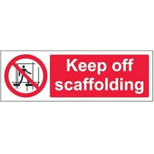 VSafety 52008BP-S "Keep Off Scaffolding" förbud tillträdesskylt, självhäftande, landskap, 600 mm x 200 mm, svart/röd