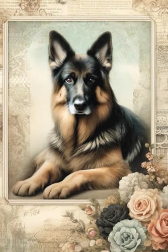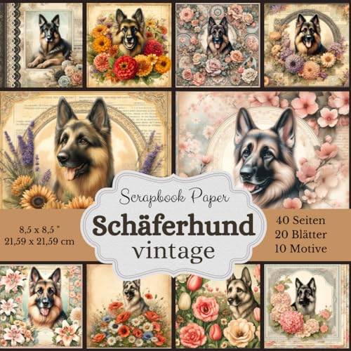 Scrapbook Papier Kollektion: Vintage Schäferhund mit Blumen: Große, wunderschöne Motive. 20 Blätter doppelseitig bedruckt (40 Seiten insgesamt) in 10 verschiedenen Designs. 21,59 x 21,59 cm