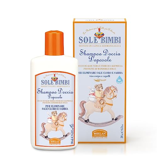 Helan, Bimbi sol, dusch för barn, fuktgivande och lugnande schampo för ansikte, kropp och hår, återställande med sött mandelprotein och extrakt av Aloe Vera och ringblommor - 200 ml