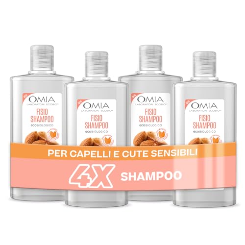 Omia Fysio Schampo med mandelolja från Sicilien för hår och känslig hud, mild formel, schampo för frekvent tvätt, utan silikon och SLES, 4 flaskor à 200 ml