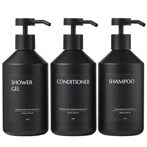 Janxin 3-pack svarta tvålpumpar 500 ml, påfyllningsbara flaskor för schampo och balsam, dispenser med pump i rostfritt stål och etiketter (svart flaska + svart lock)