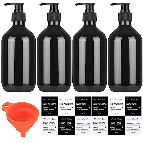 4-Pack Tomma Schampoflaska, 500 ml Tvål Dispenser, Plast Flaakor med Pump Dispenser för Kroppslotion, för Flytande Tvål, Schampo, Balsam, Duschgel, med Tratt, Etiketter