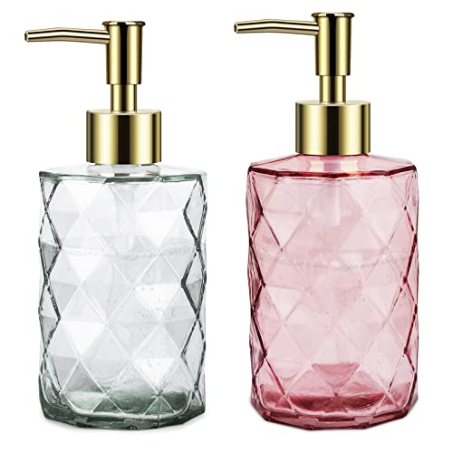 Tvålpump glas, 2 stycken tvåldispenser diskmedelsdispenser, 350 ml med rostfri pump i rostfritt stål för badrum, kök, handtvål, duschgel, schampo, diskmedel (transparent + rosa)