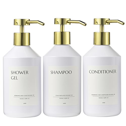 Janxin 3-pack plastflaskor med pump, för diskmedel, schampo och balsam, tvåldispenser för badrum, passar för kök, badrum och hotell (vit flaska + guldlock)