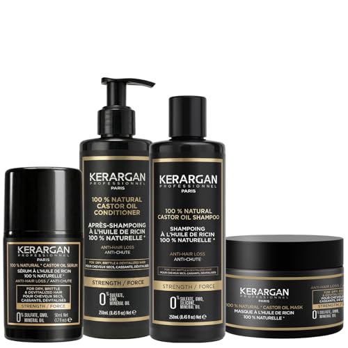 Kerargan - Set med anti-fall schampo, balsam, mask och serum med ricinolja för trött, torrt, sprött hår - främjar tillväxt - sulfatfri, silikon - 3 x 250 ml 1 x 50 ml