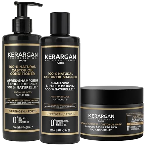 Kerargan - Trio anti-fall schampo, balsam och ricinolja mask för torrt, sprött eller devitaliserat hår - påskyndar hårväxten - sulfatfri, silikon - 3 x 250 ml