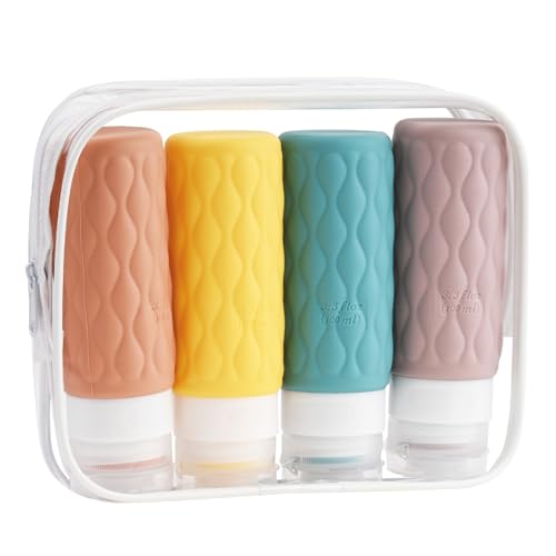 LIYUABU Läckagesäkra silikon reseflaskor, 4-pack 57 ml vätska klämbara påfyllningsbara bärbara tillbehör/kosmetiska behållare, BPA-fri, resestorleksflaskor för toalettartiklar schampo balsam lotion