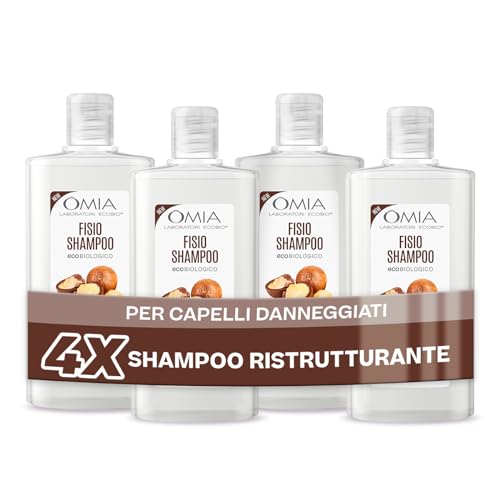 Omia Fysio Eco Eco Shampoo med Macadamiaolja för skadat hår, reparation och renovering, schampo för frekvent tvätt, utan silikon och SLES, 4 flaskor à 200 ml