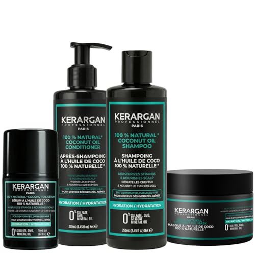 Kerargan - Fuktgivande schampo, balsam, mask och serum med kokosolja - omfattande vård för dehydrerat, skadat hår - sulfatfri, GMO, silikon - 3 x 250 ml +1 x 50 ml