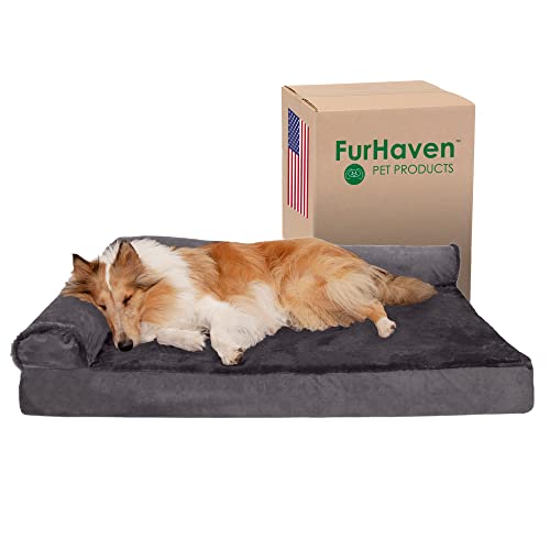 Furhaven Kylande gelskum husdjurssäng för hundar och katter – L schäslong, plyschpäls, sammet, bädd, hundbädd med avtagbart tvättbart lock, platinagrå, jumbo (X-Large)
