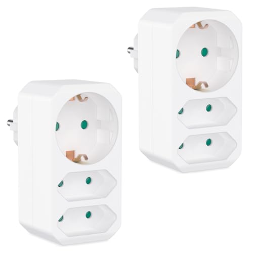 Benon Uppsättning av 2 multikontakter vit - uttagsadapter med barnsäkring - dubbel kontakt 3 680 W - multikontakt 3 fack - flera uttag 2 euro och 1 Schuko - kontakt med skyddskontakt uttag