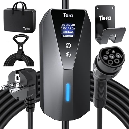 Tera Elbils-laddare bärbar typ 2 med 7 m laddningskabel 3 kW 16 A Schuko elbils-laddare box justerbar ström klar LCD-skärm IP66 vattentät kabelhållare buntband tysk bruksanvisning