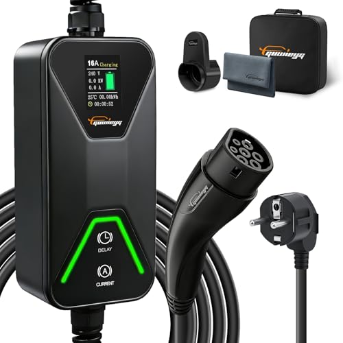 GUWIEYG Typ 2 Laddningskabel Schuko 3,5kW, 8-16A, 6m justerbar ström, IEC 62196 Bärbar laddare för PHEV/EV med bärväska, IP66 Vattentät
